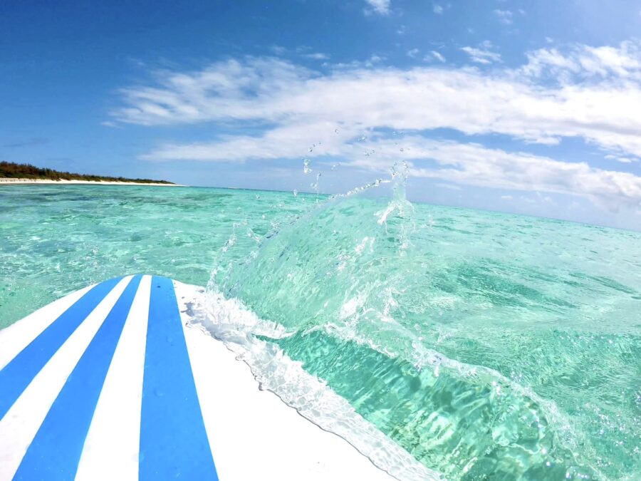 クルージングをしながら久米島の美しい海や自然に目を向けたり、ボードに寝そべって空を眺めくつろいだりと、ゆったりとした時間を過ごすことができます。