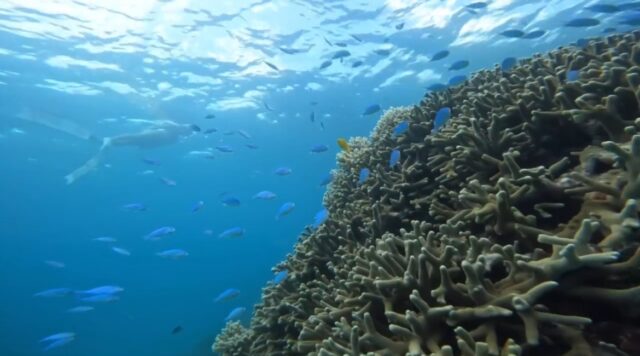 久米島の海でシュノーケリング中にウミヘビと遭遇する瞬間 はての浜上陸